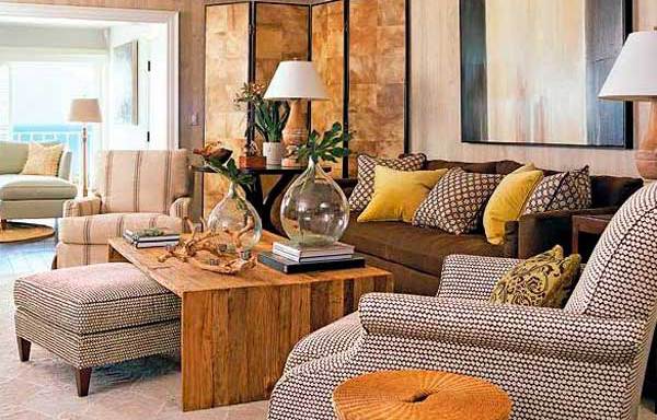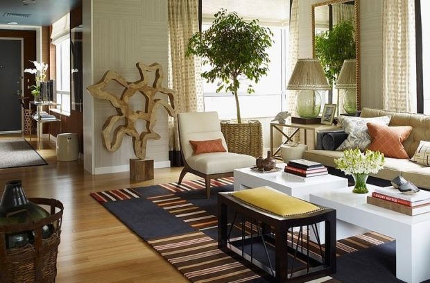 Si les tailles salon laisse mettre le canapé une forme simple au milieu pour qu'il soit pratique de l'approcher de tous les côtés. Placez un peu de laine sur le sol tapis et placez une table basse avec un plateau en verre et des pieds en bois. Décorez l'un des murs avec des coupes de scie en bois. N'encombrez pas l'espace avec un mur de meubles, si vous n'en avez pas vraiment besoin. Placez de grandes plantes d'intérieur sur le sol dans les coins libres. Il est préférable d'utiliser des pots en bois ou en céramique dans le même style. Les équipements de nouvelle génération ne doivent pas être affichés et mis au centre de l'attention comme dans les intérieurs de haute technologie. Dans ce cas, vous devez essayer de le masquer dans un niches ou systèmes coulissants.