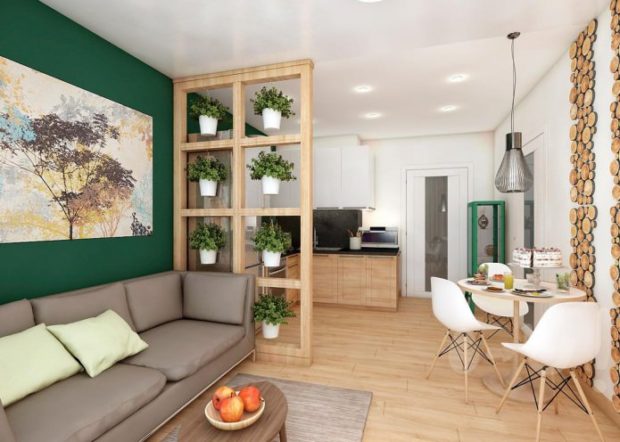 Option idéale il y aura un réaménagement avec l'expansion et l'augmentation de la taille des ouvertures de fenêtres. De plus, si possible, il est préférable de supprimer toutes les cloisons qui ne sont pas porteuses, de sorte que plus d'espace soit formé. On pense généralement que studio, dans lequel un salon avec une salle à manger est combiné, ou un salon avec un couloir est considéré comme le meilleur tremplin pour l'incorporation des lois fondamentales de l'éco-style.