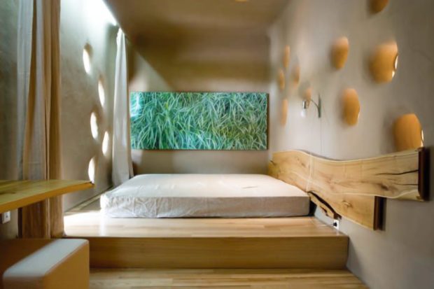 Chambre à coucher dans un style écologique doit être fourni exclusivement pour un - sain dormir et repos. Par conséquent, il doit avoir un bois massif le litau besoin table de chevet ou coiffeuse. Pour petites pièces Choisissez des meubles dans des tons clairs. Les fenêtres peuvent être rideaux avec des rideaux en coton. Et, bien sûr, les murs et le sol doivent être finis avec des matériaux naturels. Les petites chambres sont mieux décorées avec du papier peint clair avec de petites fleurs ou unies.