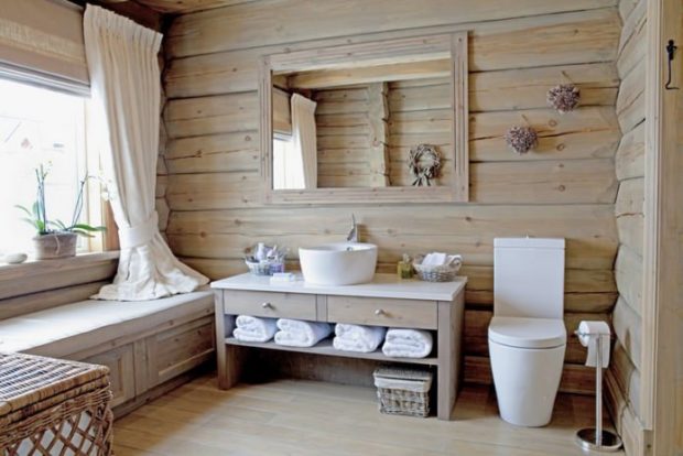 Dans cette pièce, vous ne pouvez atteindre l'appartenance au style écologique qu'à l'aide de matériaux de revêtement ou de meubles en bois véritable. Complète également parfaitement le décor. évier forme inhabituelle dont la surface imite une vraie pierre. Une salle de bain, dont la forme ressemblera à une baignoire, convient également. Conclure un miroir dans un cadre en bois simple mais massif, choisissez plus soigneusement vos accessoires de salle de bain. Un verre à brosse à dents ou un distributeur de savon liquide peut imiter un produit en pierre naturelle. N'oubliez pas l'utilisation de galets à l'intérieur de la pièce. Outre le fait qu'il peut simplement être versé dans un certain endroit, il peut effectuer des travaux de parement. Ainsi, votre bain ressemblera à la côte de la mer. Un panier à linge en plastique doit être remplacé par un produit en osier.