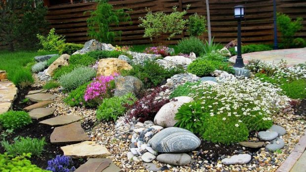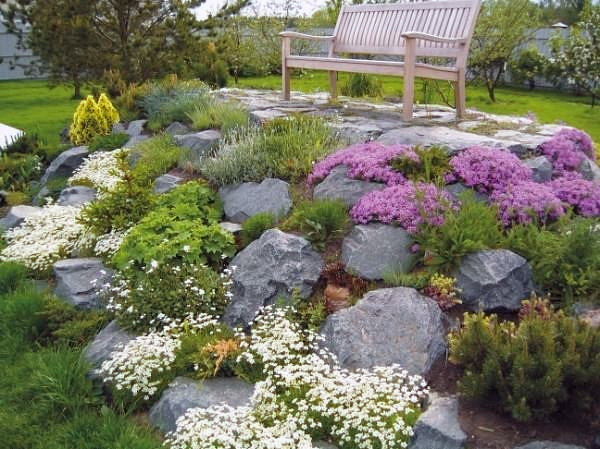 - Rocaille - Soudoie beaucoup avec son originalité. Un parterre de fleurs similaire est un mélange de pierres, de divers arbustes bas, de plantes à fleurs basses, de céréales ornementales et de variétés herbacées. Les plantes sont plantées entre des pierres de formes et de tailles différentes, mais contrairement à une colline alpine, la rocaille est une surface plane.