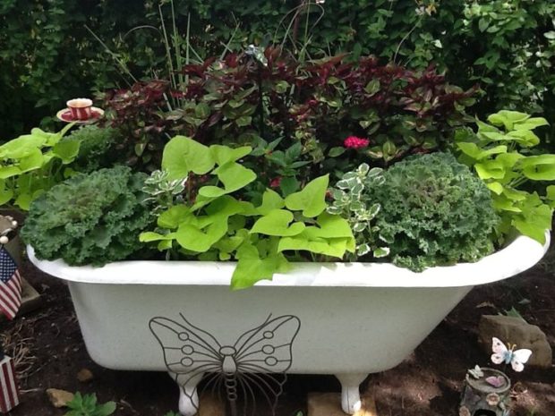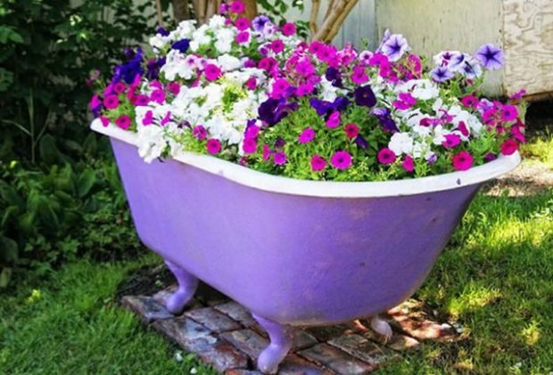 Outre le fait que la surface intérieure vieux bain vous pouvez le peindre en bleu, le creuser dans le sol et en faire un mini-étang, vous pouvez l'utiliser comme un très grand pot de fleurs. Installez-le simplement dans un endroit approprié, décorez la surface extérieure et ennoblissez avec des plantes. Il est possible de construire un coffrage en bois pour un tel parterre de fleurs, s'il n'y a pas de belles jambes sculptées.