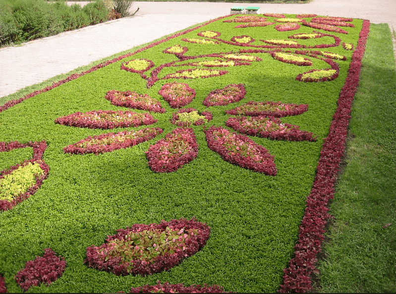 - Arabesque ou rez-de-chaussée - L'un des parterres de fleurs les plus réfléchis et les plus sommaires. Les plantes sont disposées dans un ordre strict et forment divers symboles et motifs. Son organisation nécessite une approche approfondie et de la patience.