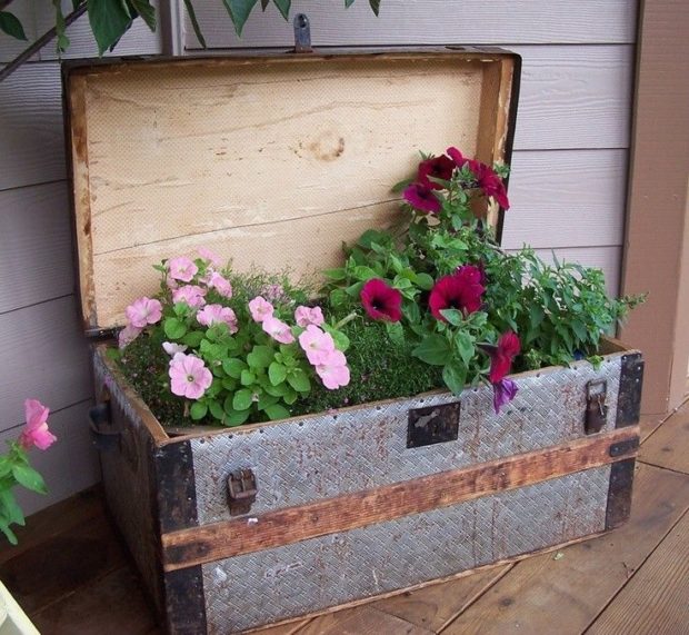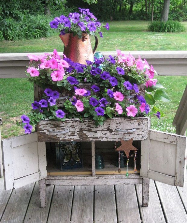Vous pouvez flotter et de vieux meubles. Chaises commodes, juste des boîtes de l'ancien buffet - tout ce qui se trouve mal et peut accueillir au moins une petite quantité de terrain. Poncez les éléments en bois, ouvrez avec du vernis ou peindre, mis dans un endroit approprié et commencez à planter. Pour ce faire, toutes les surfaces doivent être recouvertes d'un film. Assurez-vous de bien manipuler le bois et de le laisser bien sécher. Des éléments similaires ont fière allure dans un duo. Par exemple, une commode en combinaison avec plusieurs chaises ou simplement une paire de chaises. Ces parterres de fleurs sont bien adaptés pour décorer un terrain avec une maison dans un style rustique ou Style provençal.