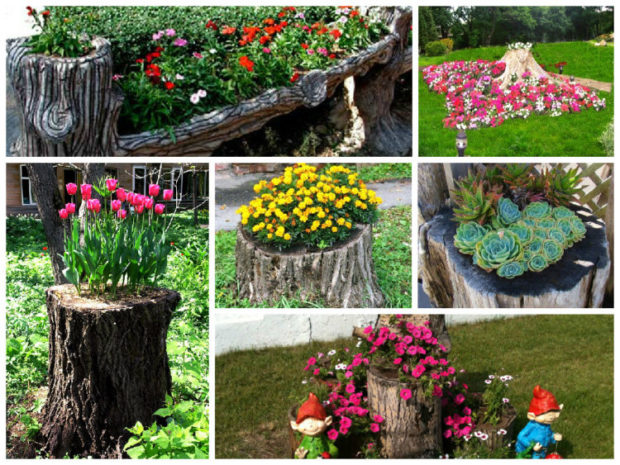 Sur n'importe quel site, il y a une vieille bûche ou une souche d'un arbre abattu. Il est presque impossible de voir une vieille souche sans une sensation d'irritation interne. Il doit donc être relancé! Pour ce faire, retirez l'intérieur de celui-ci avec une scie, un burin ou un autre outil qui vous convient. Après cela, il est nécessaire de couvrir la cavité formée avec du polyéthylène, de la remplir de terre et de planter des fleurs dans un pot de fleurs improvisé. Maintenant, ce n'est pas seulement une vieille souche pourrie, mais un élément de l'aménagement paysager.