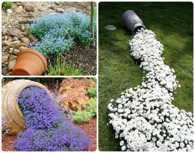 Ce type de parterre de fleurs est très simple à réaliser de vos propres mains. Il se distingue par sa simplicité d'organisation et son apparence étonnante, qui n'a pas encore eu le temps de devenir ennuyeux. L'idée est de créer l'illusion qu'un liquide s'écoule d'un vaisseau renversé au sol, dans le rôle duquel les fleurs vont agir.