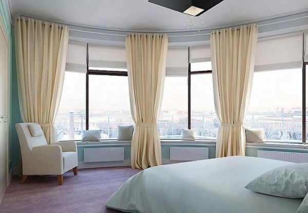 Règle principale lors du choix des rideaux pour les fenêtres panoramiques - ils ne doivent pas détourner l'attention de la fenêtre elle-même. Ainsi, les rideaux lourds avec toutes sortes de lambrequins et autres volants ne fonctionneront pas. Dans ce cas, plus c'est simple, mieux c'est. Bien sûr les rideaux doivent être en harmonie avec la palette de couleurs de la pièce et son style, mais en fait, ils n'ont qu'à remplir leur tâche principale - créer une atmosphère intime.
