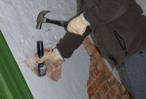 - Les couches de plâtre, qui elles-mêmes ont déjà commencé à tomber en couches entières, sont généralement d'abord tapotées avec un marteau, puis elles bordent les bords avec à l'aide d'une spatule. Parfois, vous pouvez taper sur le manche d'une spatule avec un marteau pour l'enfoncer plus profondément sous le plâtre et ainsi casser la plus grande couche. Pour faciliter le processus et réduire la quantité de poussière, mouillez périodiquement la surface. Si, à certains endroits, des fragments de l'ancien revêtement ne se prêtent pas à une spatule, laissez-les pour plus tard. D'autres méthodes seront nécessaires pour les supprimer;