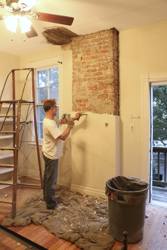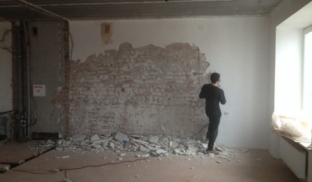 Sur de nombreuses ressources, vous pouvez trouver des recommandations qu'il est préférable de commencer à travailler par le haut et de descendre. En fait, cette image s'avère - vous avez tapé sur les coins, le long du chemin, certaines couches de plâtre sont tombées par elles-mêmes, ont commencé à descendre, ont traversé les 2/3 des murs et se sont arrêtées. Ils se sont arrêtés car une quantité suffisante de débris de construction s'était déjà accumulée sur le sol, ce qui ne permettait tout simplement pas d'atteindre le bas du mur. Nous devrons nous arrêter, le ramasser sur le côté (ou mieux immédiatement dans un sac, afin de ne pas faire un travail deux fois), et ensuite continuer. Donc mieux commencer avec bas du mur. Même si vous devez remplacer un tabouret, les fragments ébréchés ne vous dérangeront pas. Vous le placerez près du mur, il sera juste gênant de travailler, car tout volera au visage.