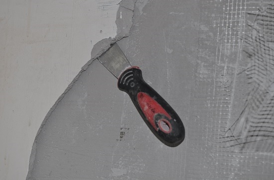 - Maintenant besoin déterminer l'épaisseur du plâtre et s'il est dans un tel état dans toute sa profondeur. Pour ce faire, essayez de ramasser le plâtre à l'endroit de la formation de sillon avec la même spatule ou un tournevis plat. Si l'outil est facilement inclus et que vous avez même réussi à dégager une petite zone jusqu'au mur de cette manière, vous devrez retirer la solution.