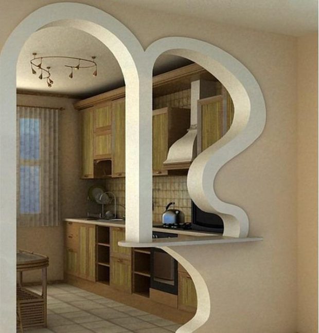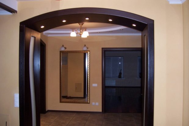 Très souvent, un tel élément est essentiel à l'intérieur, et toute la décoration en dépend. Vous pouvez acheter des portails prêts à l'emploi de type arc à partir d'une variété de matériaux, mais vous pouvez faire arche par vous-même. Souvent, le cadre de la forme souhaitée est monté à partir de profils métalliques et gainé de cloisons sèches. Au lieu de profils, vous pouvez utiliser des planches de bois d'épaisseur suffisante. Une couche de plâtre est appliquée dessus, puis des finitions décoratives sont effectuées. Très souvent, des arcs peuvent être trouvés comme élément de liaison entre la loggia. Ils peuvent avoir des étagères intégrées, des lumières, des niches pour placer des objets de décoration ou un fragment comptoir de bar. Il peut également être utilisé comme coiffeuse ou espace pour les plantes d'intérieur. Avantage la conception de la porte sous la forme d'un arc est qu'il peut être entré dans presque tous les styles d'intérieur. Sélectionnez simplement la forme et le matériau de finition appropriés.
