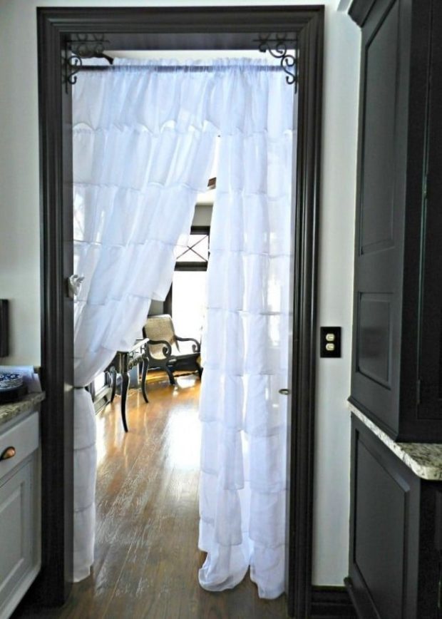 La conception de portes utilisant des éléments textiles peut être considérée comme la plus romantique de toutes les méthodes.Un tulle translucide se développant dans le vent créera une atmosphère incroyable, surtout si vous choisissez un tissu avec un fil brillant à peine perceptible qui scintillera au soleil. C'est à l'aide de rideaux que vous pouvez créer un tel design qui, si nécessaire, créera une atmosphère isolée. Si, néanmoins, vous décidez de connecter la chambre au salon ou à une autre pièce, choisissez des rideaux opaques avec des crochets latéraux pour décorer la porte.