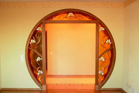 - Retenu et noble style classique mieux compléter les ouvertures de type arqué. Dans ce cas, les arcades sont de préférence ovales, tricentriques ou semi-circulaires. Bien sûr, le classique n'est pas complet sans un matériau comme le bois, qui peut être décoré de sculptures décoratives ou de fraisage;