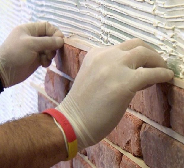 Choisir une finition en pierre naturelle est un must prendre en compte son poids et sélectionner un mélange adhésif spécifiquement pour un tel matériau. De plus, l'installation complique également le fait que les fragments peuvent glisser sous leur propre poids, donc soit ils doivent être posés en utilisant la même technologie que tuile - à l'aide d'un morceau de profilé métallique et de coins, ou maintenez chaque galet pendant plusieurs minutes jusqu'à ce que la colle attrape.