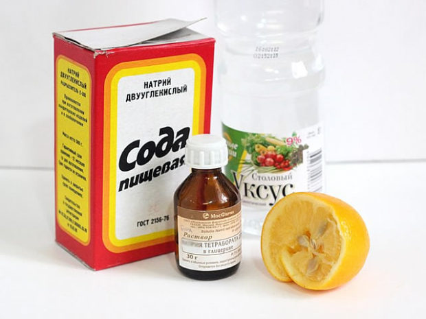 - Solution alcaline fait également face à la tâche. Vous aurez besoin d'un récipient d'eau chaude et de soda nature. Dissolvez 5 cuillères à soupe de soda dans 10 litres d'eau tiède et attendez que l'eau refroidisse un peu.