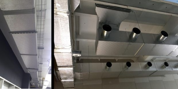 - Pour l'organisation systèmes de ventilation pour conduits d'air, chauffage ou climatisation à base de plaques recouvertes de papier aluminium. Des conceptions similaires ont 5-8 fois moins de poids que celles en acier. Le processus d'installation est beaucoup plus simple que la construction de structures en acier. Et dans certains cas, lorsqu'il existe des restrictions sur la charge des structures portantes, une telle solution est la seule possible. Dans le même temps, les plaques PIR sont ignifuges - elles ne supportent pas et ne propagent pas de flamme et ne créent pas de gouttelettes fondues dangereuses. Et l'amarrage avec des éléments en acier se fait à l'aide de raccords à bride standard;