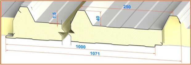 Selon le fabricant, ils changent et caractéristiques géométriques panneaux. En moyenne, ils peuvent avoir une épaisseur de 40 à 200 mm. La plupart ont une largeur de 1000 à 1071 mm pour les toitures et de 1185 à 1205 mm pour les panneaux muraux.