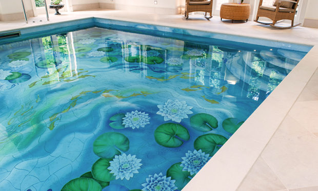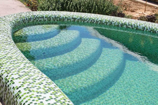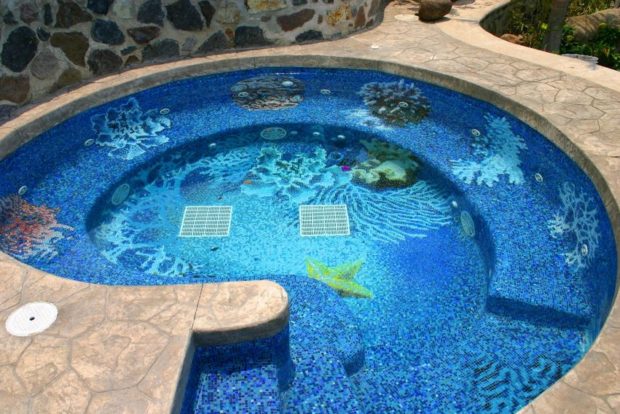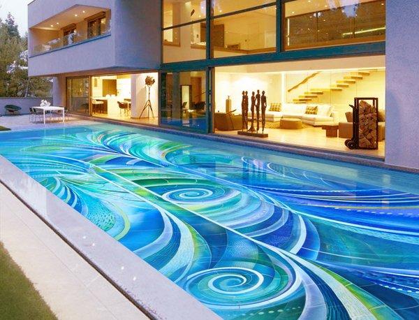 Lorsque des colorants sont ajoutés à la composition pendant la fabrication, chaque carreau individuel peut avoir sa propre teinte individuelle, qui se manifeste le plus clairement précisément sous l'eau. Cela crée un effet de scintillement interne et une superbe illusion d'optique. L'eau de la piscine commence à déborder et à clignoter.