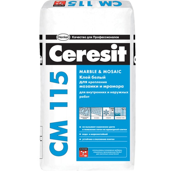 - À la société pour l'adhésif pour carrelage de marque Ceresit compositions de jointoiement recommandées d'un fabricant similaire. En combinaison avec des mélanges de CM 117 et CM 117 et CM 115, il est souhaitable d'utiliser un coulis hydrophobe, résistant au gel et étanche sur une base polymère-ciment Ceresit CE 43 ou une composition époxy Ceresit CE 44, Ceresit CE 47 ou Ceresit CE 48;