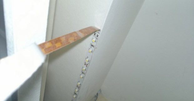 - Très souvent au-dessus de la porte d'entrée ou au-dessus de la porte qui mène à la cuisine, il y a mezzanines. Nous utilisons tous activement ces lieux pour stocker des articles que nous utilisons très rarement. Naturellement, les constructeurs ne pensaient pas que dans un tel endroit ne nuirait pas à la présence d'une lampe, dans le rôle duquel la bande LED agira. Il est suffisamment lumineux pour éclairer les coins les plus éloignés des mezzanines et, surtout, n'occupe pas d'espace utilisable.Et si vous équipez la conception d'un capteur qui déclenchera l'ouverture des portes, l'utilisation d'un tel système d'éclairage deviendra beaucoup plus pratique;