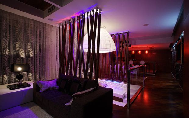 - Réception zonage léger souvent trouvé dans les salons combinés avec une salle à manger ou un couloir. Cette méthode est bonne car elle ne prend pas de place précieuse et est très belle en soi. À ces fins, une bande LED qui peut être montée au sol avec un profil spécial est parfaitement adaptée. Au-dessus de la ligne de lumière au sol, des projecteurs à diodes au plafond dans la même direction doivent également être situés. Un portail lumineux se forme, qui délimite clairement l'espace.