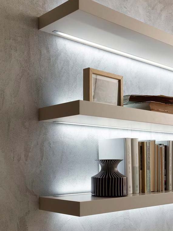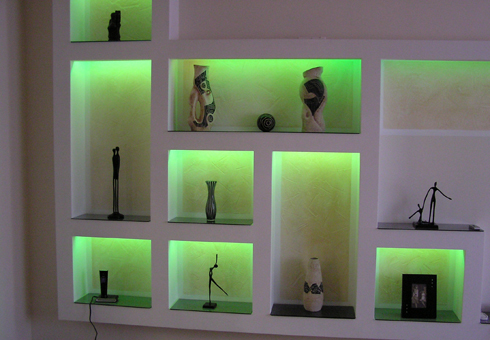 - Un effet intéressant peut être obtenu en surlignant étagères murales. De plus, le ruban peut être collé à la fois sur leur plan inférieur et sur le dessus ou autour du périmètre. L'essentiel est de positionner la source de lumière plus près du mur afin que la lumière soit projetée doucement dessus. Ces étagères elles-mêmes agiront comme des éléments décoratifs, alors empilez-les avec divers vases, statuettes et d'autres petites choses n'en valent pas la peine. Un, deux articles - pas plus. Mieux encore, mettez vos photos préférées dans des cadres en verre;