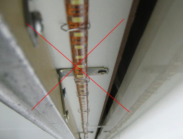 Il est assez difficile de procéder à l'installation d'une bande de diodes de manière incorrecte, cependant, il existe de telles méthodes de montage non conventionnelles qu'il vaut mieux éviter: