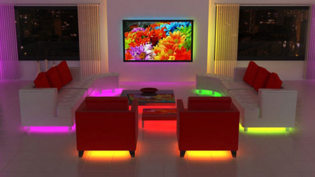 - Rétroéclairage du canapé ou table basse créera l'effet de meubles planant au-dessus du sol. Surtout si les meubles sont bas, banals. Le rétro-éclairage du canapé peut être placé à la fois derrière son dos, de sorte que la lumière tombe sur le mur et sur le bas de la base. Si vous décidez de mettre en valeur une table basse avec un plateau en verre, n'oubliez pas qu'en plaçant le ruban avec des diodes vers le bas, vous rendrez son dos visible. Cela peut ruiner l'apparence esthétique des comptoirs. Par conséquent, il est préférable de monter la bande sur des zones opaques;