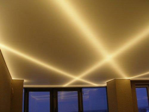 - Vous pouvez également effectuer un plafond tendu d'éclairage caché. L'effet sera tout simplement incroyable. Pour ce faire, fixez le ruban à l'aide de supports spéciaux du plan du plafond principal, puis étirez le film PVC. Positionnez le ruban de sorte qu'il forme un motif spécifique.