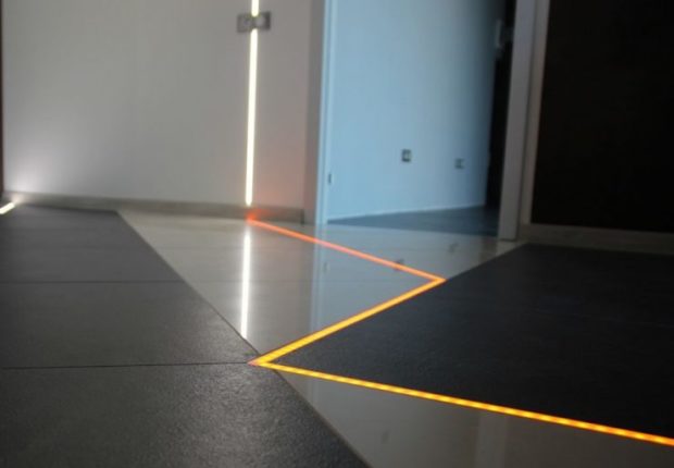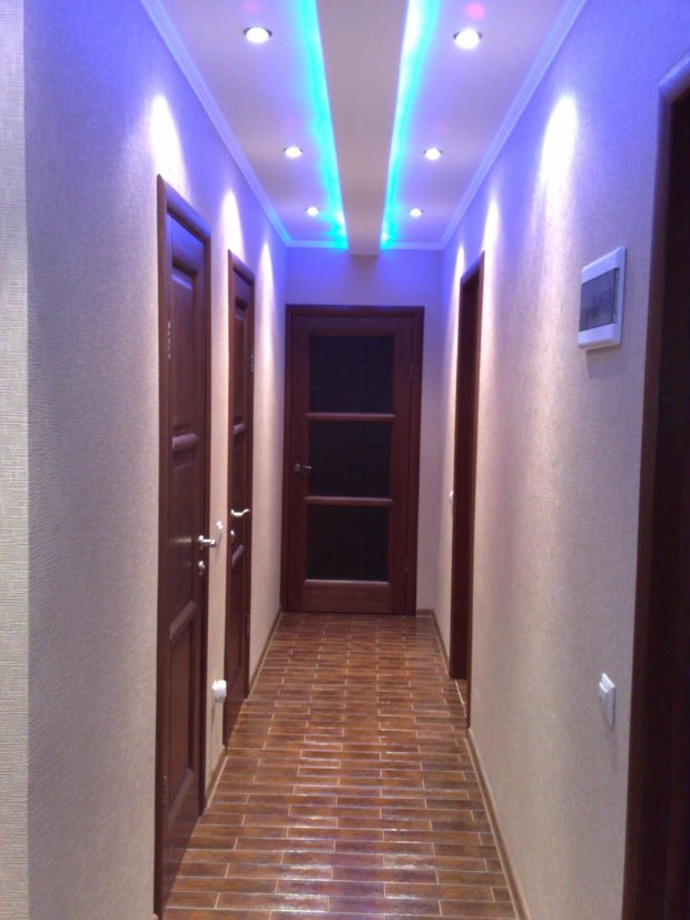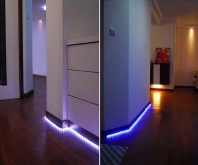 - Si votre couloir n'est pas encombré de beaucoup de meubles, il est conseillé de réaliser éclairage au sol. Autrement dit, utilisez des plinthes spécialement conçues à ces fins. Sur leur partie avant, il y a une rainure dans laquelle le ruban est collé, et qui est ensuite fermée avec une bande transparente spéciale. Le design est presque le même que d'habitude plinthe. Soit dit en passant, si vous décidez de simplement coller le ruban adhésif sur la plinthe en MDF ou sur une plinthe en plastique ordinaire à l'endroit où ils sont vissés vis et ne fermez pas l'évidement avec une barre, puis abandonnez immédiatement cette idée. Premièrement, une bande non fermée sera rapidement recouverte de poussière, ce qui peut entraîner un épuisement professionnel. Deuxièmement, en raison de l'absence d'une bande de protection, il sera très difficile de nettoyer à l'eau;