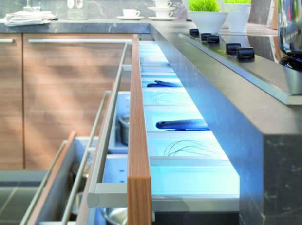 - Chaque armoire de cuisine, à charnières et coulissantes, peut également être rendue plus pratique à utiliser si vous fournissez un niveau d'éclairage suffisant. Vous pouvez équiper le système de capteurs qui répondent à l'ouverture;