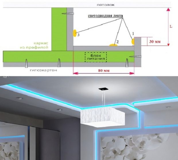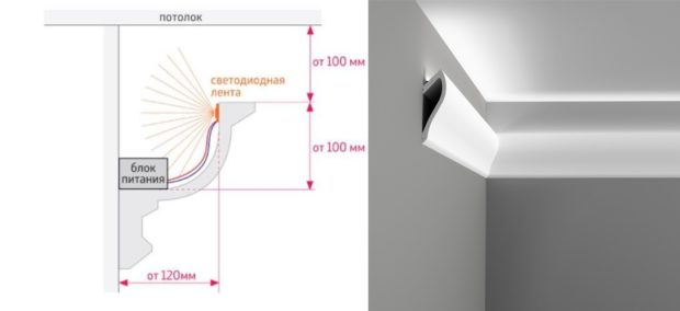 - Montage sur corniche de plafond. C'est une façon de fixer le rétro-éclairage au plafond. Les images ci-dessous montrent un diagramme de l'emplacement correct de chaque élément.