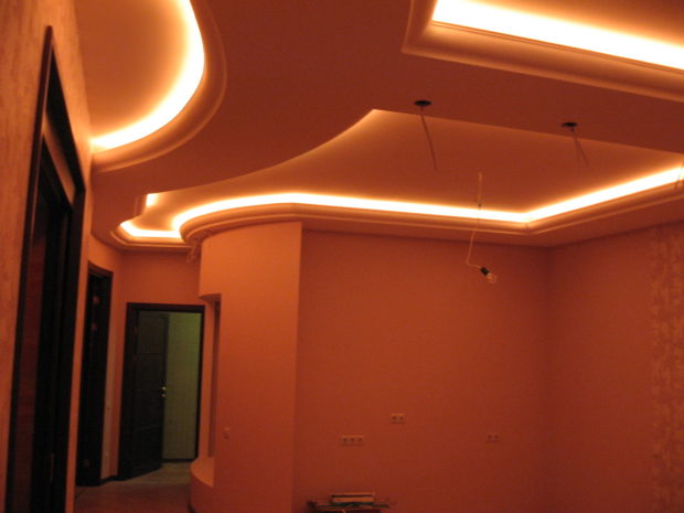 - Ne peut être ignoré éclairage de voûte de plafonda. Dans ce cas, il existe de nombreuses options pour placer la bande. L'effet que vous obtenez à la fin en dépend. Nous parlerons de la façon de fixer le ruban au plafond un peu plus tard.