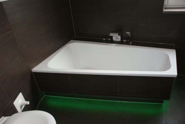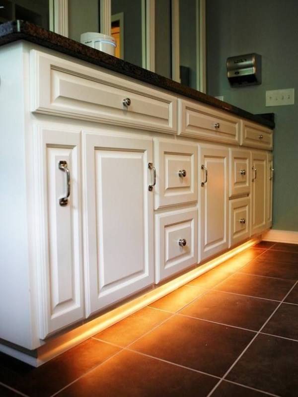 - Ça a l'air très intéressant lumière de bain autour du périmètre du sol. Une telle lueur douce sera confortable pour les yeux même la nuit et agrandira légèrement l'espace;