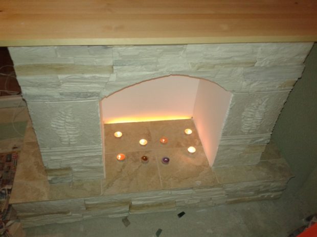 - À l'aide d'une bande de diodes jaune chaud, vous pouvez facilement simuler la lumière d'un feu dans une cheminéefaites-le vous-même. Cheminées bio ou électriques - le plaisir n'est pas bon marché. Par conséquent, de plus en plus se trouvent à l'intérieur fausses cheminéesqui ne peut que ressembler à distance au portail lui-même. Même une si petite similitude suffit pour apporter un peu de chaleur et de confort à l'intérieur. Souvent, dans la zone où le bois de chauffage doit brûler, ils mettent des bougies. Cette méthode n'est pas entièrement sûre. Par conséquent, il est préférable de mettre en surbrillance le foyer avec du ruban adhésif, mais pour qu'il ne soit pas visible. L'effet sera ce dont vous avez besoin!;
