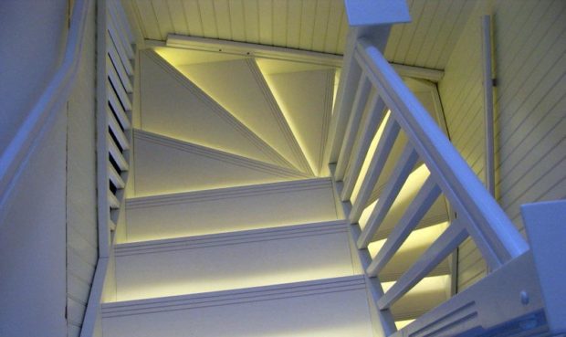 - Les appartements en couches ou les salons dans les maisons privées ont un élément comme un escalier. Et pour vous, cela devrait être une merveilleuse toile pour la créativité. L'escalier peut être brillant de diverses manières. Il convient de noter que cela non seulement semble spectaculaire, mais réduit également le risque de blessure.L'essentiel est d'agencer la bande de sorte que lorsque vous regardez les étapes, sa lumière ne vous aveugle pas, mais crée seulement un rétro-éclairage doux et indique le chemin. Choisissez différentes couleurs, en les assortissant à la couleur des murs environnants ou des marches. Décorez la balustrade, les extrémités des marches ou posez le ruban dans des plinthes spéciales, en général - allez-y!;