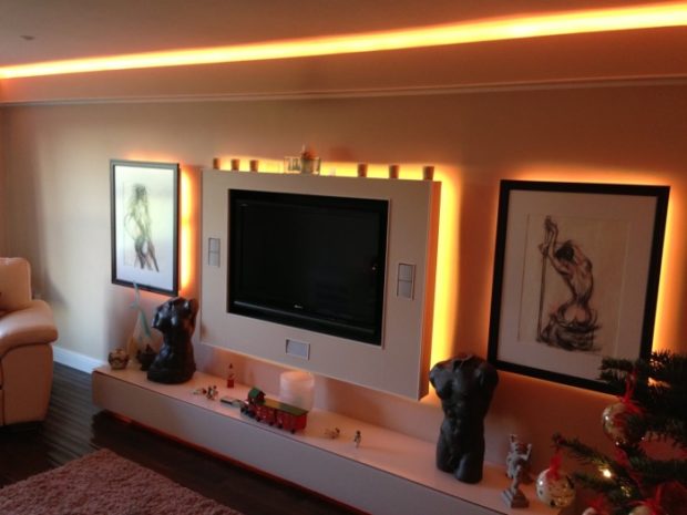 - Rétroéclairage de la zone TV, à savoir le téléviseur lui-même, a commencé à être utilisé il n'y a pas si longtemps, mais a instantanément gagné beaucoup de fans. La bande de diode est montée à l'arrière de l'écran du téléviseur aussi près que possible des bords. Grâce à cela, la lueur couvre une grande zone du mur sur laquelle le téléviseur est fixé. Un tel éclairage semble particulièrement impressionnant dans les cas où un ruban de couleur est utilisé ou lorsque le mur a un motif texturé. Chaque irrégularité devient instantanément plus prononcée et visible;