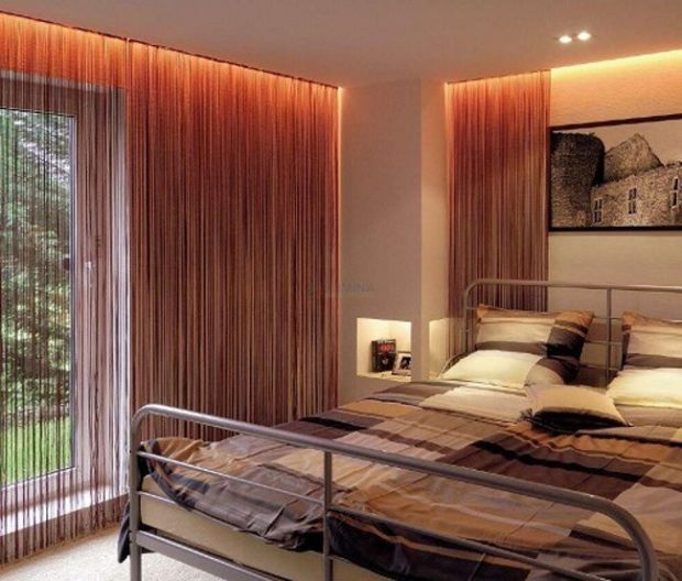 - Si un balcon ou une loggia jouxte la chambre, qui en principe ne nécessite pas d'éclairage lumineux, il est conseillé d'utiliser une barrette de diodes pour les éclairer.Et lorsqu'il sera nécessaire de créer une atmosphère intime dans la chambre, il sera possible d'allumer la lumière uniquement sur place et de fermer les rideaux;