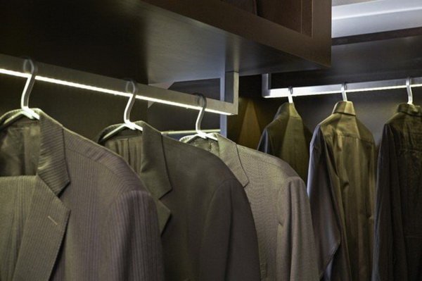 - La plupart des intérieurs modernes ne peuvent pas se passer de vestiaires. Pour éclairer chacune de ses sections, vous pouvez également utiliser une bande LED.