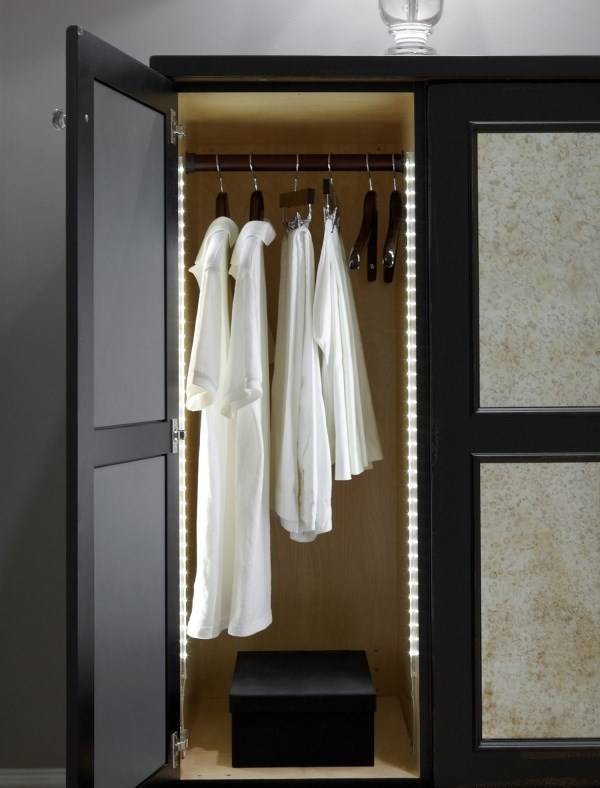 - Une autre façon utile d'utiliser la bande est de l'installer dans garde-robe ou une armoire à chaussures. En effet, même lorsque l'éclairage aérien est allumé, toute la cavité interne de ces meubles n'est pas éclairée dans la mesure nécessaire.
