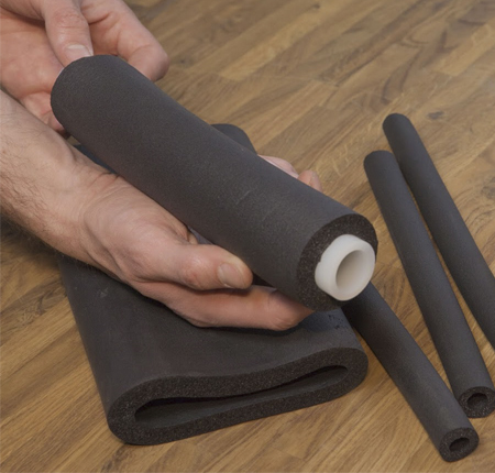 Le caoutchouc mousse convient pour isoler l'isolation des tuyaux produit dans sous forme de feuille ou creux tubes divers diamètres. Il a une section standard pour les tuyaux d'un diamètre de 6 à 114 mm. L'épaisseur de l'isolant atteint 6 à 32 mm. Pour les tuyaux plus gros, le caoutchouc en feuille est prévu. La fixation du matériau se fait de la même manière que les feuilles de polyéthylène.
