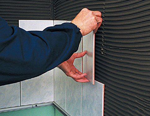 - Posez la première tuile dans le coin, en vous déplaçant de gauche à droite. N'oubliez pas que le coin le plus visible doit être le plus beau et ne pas avoir de garniture;