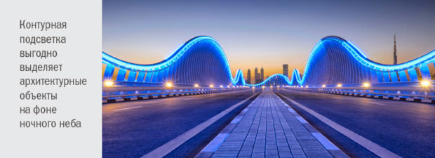 - Contouring rétroéclairage - réalisé à l'aide de lampes LED de type linéaire. D'après le nom, il est clair que les dispositifs d'éclairage sont installés le long des contours d'un objet particulier et est avantageux souligner les silhouettes non standard;