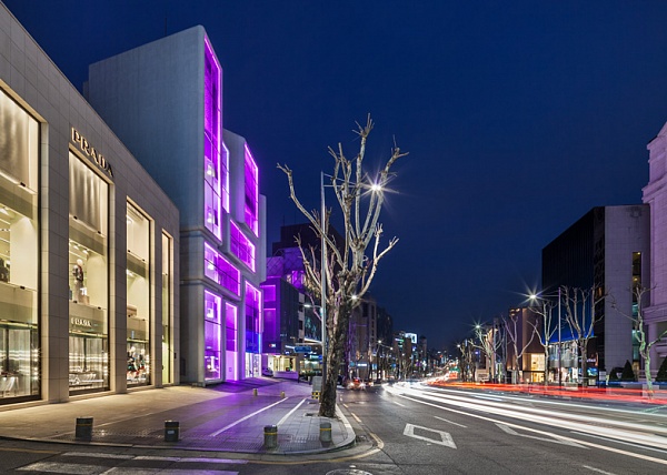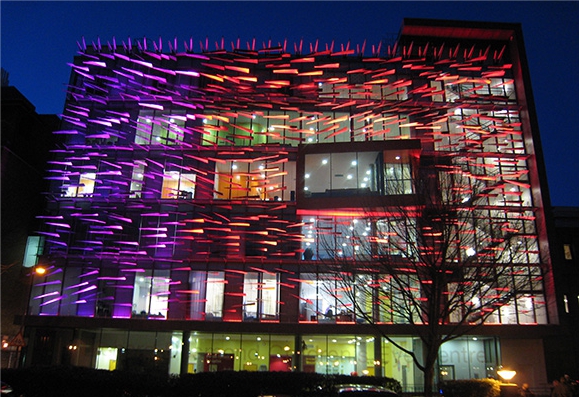 - Le système "Façade claire" - Il est utilisé pour mettre en évidence les centres commerciaux ou commerciaux à plusieurs étages modernes. En principe, il peut être appliqué à tout objet dont façades en plastique ou verre. La différence de ce système est que les dispositifs d'éclairage sont installés derrière la vitre et que leur flux lumineux est dirigé vers l'ouverture de la fenêtre de manière à créer un effet statique ou dynamique. Les luminaires eux-mêmes peuvent être monochromes ou RVB;