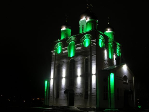 - Total ou inondation - il est utilisé, si nécessaire, pour séparer un objet ou une structure séparée, y compris les grands monuments culturels, les églises ou les cathédrales. Ce type d'éclairage peut être réalisé en utilisant des projecteurs RGB, blanc et ambre pour l'éclairage artistique des bâtiments. La méthode permet de transmettre pleinement la signification et l'échelle de l'objet, ainsi que d'assurer sa perception holistique. L'ensemble de l'objet est mis en évidence et une partie du territoire adjacent. Cependant, il faut comprendre qu'avec l'éclairage, des projecteurs sont installés directement en face du bâtiment, à une certaine distance de celui-ci ou sur des poteaux et envoyés à la façade. Par conséquent, une partie d'une lumière plutôt brillante apparaîtra constamment à travers ses fenêtres, ce qui peut apporter significatif inconfort Pour cette raison, il n'est pas recommandé de choisir un système d'éclairage similaire pour les bâtiments où les gens sont constamment localisés, par exemple pour les hôtels ou les grands centres de bureaux;