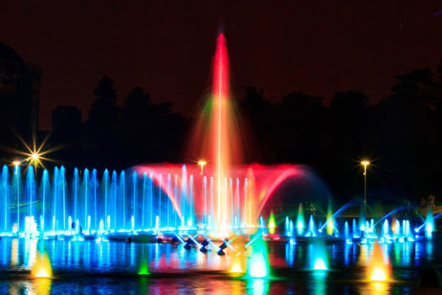 - Dynamique des couleurs l'éclairage est réalisé à l'aide de projecteurs contrôlés, de règles LED, de projecteurs et d'autres lampes.Ce système de rétroéclairage peut être utilisé dans tous les types ci-dessus, c'est-à-dire qu'il peut être à la fois inondé et contour, etc. Sa différence réside dans le fait que les luminaires contrôlés peuvent fonctionner dans différents modes - avec un amortissement en douceur et une luminosité croissante, avec un changement dans le spectre de couleurs et la synthèse des couleurs, ce qui vous permet d'obtenir des effets étonnants. Un tel éclairage est largement utilisé pour créer un design spécial de fontaines;