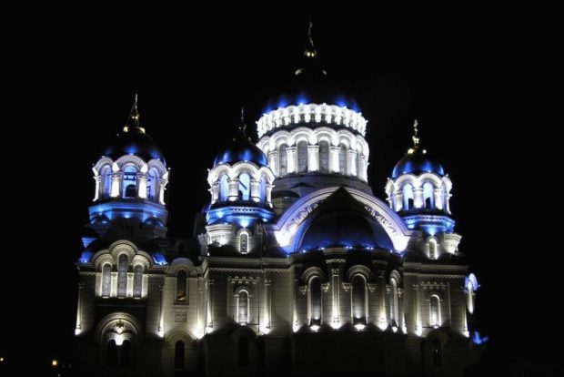 - Total ou inondation - il est utilisé, si nécessaire, pour séparer un objet ou une structure séparée, y compris les grands monuments culturels, les églises ou les cathédrales. Ce type d'éclairage peut être réalisé en utilisant des projecteurs RGB, blanc et ambre pour l'éclairage artistique des bâtiments. La méthode permet de transmettre pleinement la signification et l'échelle de l'objet, ainsi que d'assurer sa perception holistique. L'ensemble de l'objet est mis en évidence et une partie du territoire adjacent. Cependant, il faut comprendre qu'avec l'éclairage, des projecteurs sont installés directement en face du bâtiment, à une certaine distance de celui-ci ou sur des poteaux et envoyés à la façade. Par conséquent, une partie d'une lumière plutôt brillante apparaîtra constamment à travers ses fenêtres, ce qui peut apporter significatif inconfort Pour cette raison, il n'est pas recommandé de choisir un système d'éclairage similaire pour les bâtiments où les gens sont constamment localisés, par exemple pour les hôtels ou les grands centres de bureaux;