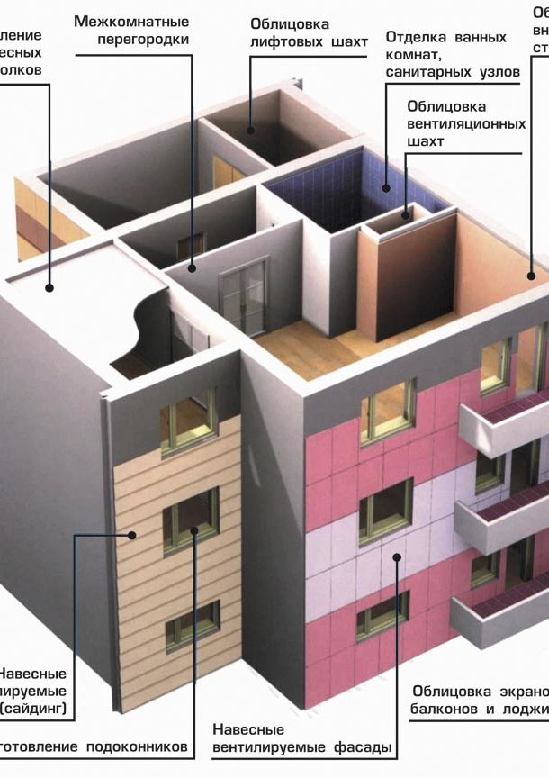 - Le revêtement extérieur des bâtiments à grand nombre d'étages, car les panneaux résistent facilement aux effets des températures élevées et des rafales de vents violents;