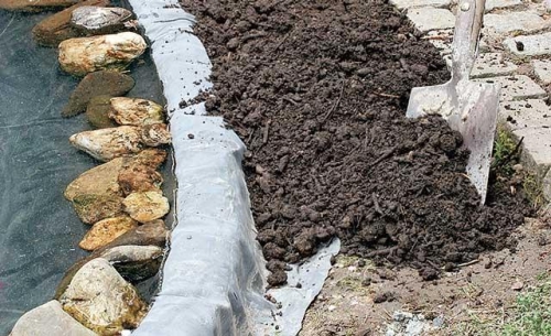 - Les restes du film le long du circuit de drainage ne doivent pas être coupés à zéro, il sera plus fiable de les cacher sous les pierres, juste en les rentrant.