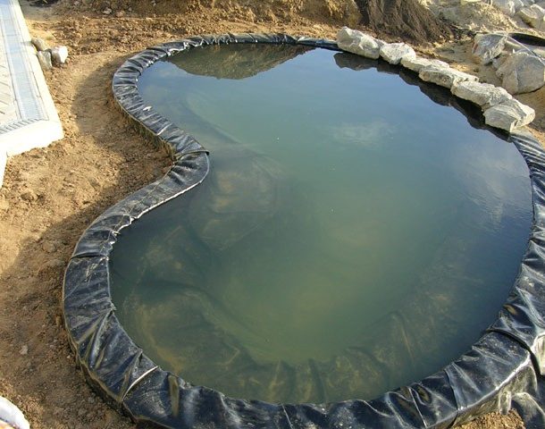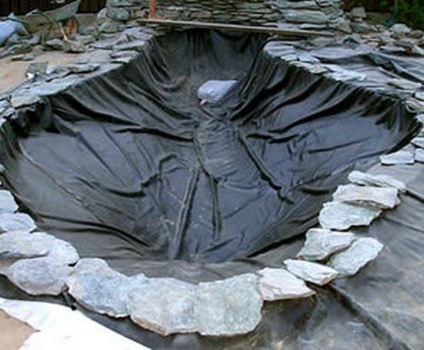 - Film. Pour l'imperméabilisation de fosses de faible profondeur et surface, un PVC film noir. Il est disponible en différentes épaisseurs. Pour les étangs dont la profondeur ne dépasse pas 80 cm, un film de 0,8 mm d'épaisseur suffit. Si la profondeur du réservoir sera supérieure à 1 mètre, vous devez choisir une toile d'une épaisseur de 1,2 à 1,5 mm. Un tel substrat fait parfaitement face à sa tâche et a une durée de vie d'environ 10 ans, mais a tendance à se fissurer sous l'influence de températures inférieures à zéro. En cas de dommages à l'intégrité du revêtement, il peut être facilement réparé à l'aide d'un ruban adhésif ordinaire. Une durée de vie plus longue caoutchouc butyle film - de 30 à 50 ans. Son coût est beaucoup plus élevé, mais est pleinement justifié. Le matériau est résistant aux basses températures, plus flexible, résistant à une exposition prolongée au soleil et convient aux étangs à poissons. Pour les très petits étangs, utilisez parfois l'habituel polyéthylène un film d'une épaisseur supérieure à 500 microns. Il est abordable, mais s'use dans les 2-3 ans. Par conséquent, ce matériel ne devrait être choisi que pour les étangs «d'essai», qui sont parfois équipés afin de comprendre s'il y a assez de force et de patience pour s'occuper d'un élément plus grand;
